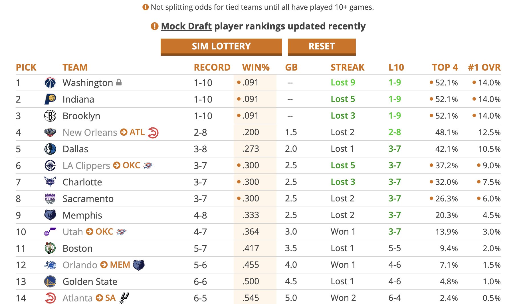 6686 ข่าวกีฬา วันที่ 12 พฤศจิกายน สื่ออเมริกัน Tankathon อัปเดตความน่าจะเป็นของลอตเตอรีร่างปี 2026 ในวันนี้ โดยพิจารณาจากบันทึกปัจจุบันของแต่ละทีมในลีก เนื่องจาก Wizards, Pacers และ Nets ต่างก็มีสถิติชนะ 1 แพ้ 10 ความน่าจะเป็นที่จะได้อันดับ 1 คือ 14% และความน่าจะเป็นที่จะได้สี่อันดับแรกคือ 52.1%