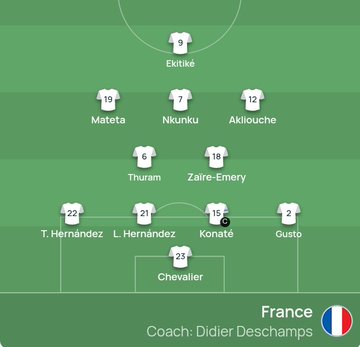 ทีมฝรั่งเศสลงตัวจริง: 23-เชอวาลิเยร์, 22-ธีโอ, 21-ลูคัส, 15-โคนาเต, 2-กุสโต, 6-ทูราม, 18-เอเมรี, 19-มัตเตต้า, 7-เอ็นคุนคู, 12-อัคลี อูเช, 9-เอคิติค