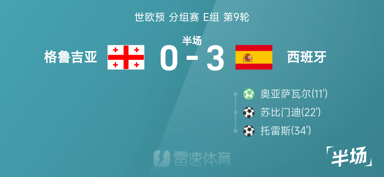 พักครึ่งแรกของยุโรปโลก: โอยาร์ซาบัลจ่ายบอลและยิงให้สเปน 3-0 จอร์เจีย