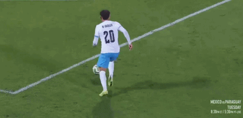 13’ การป้องกันของอุรุกวัยทำผิดพลาด ฆิเมเนซหยิบบอลและถูกผู้รักษาประตู + กองหลังสกัดกั้นเพื่อสกัดกั้นการยิง