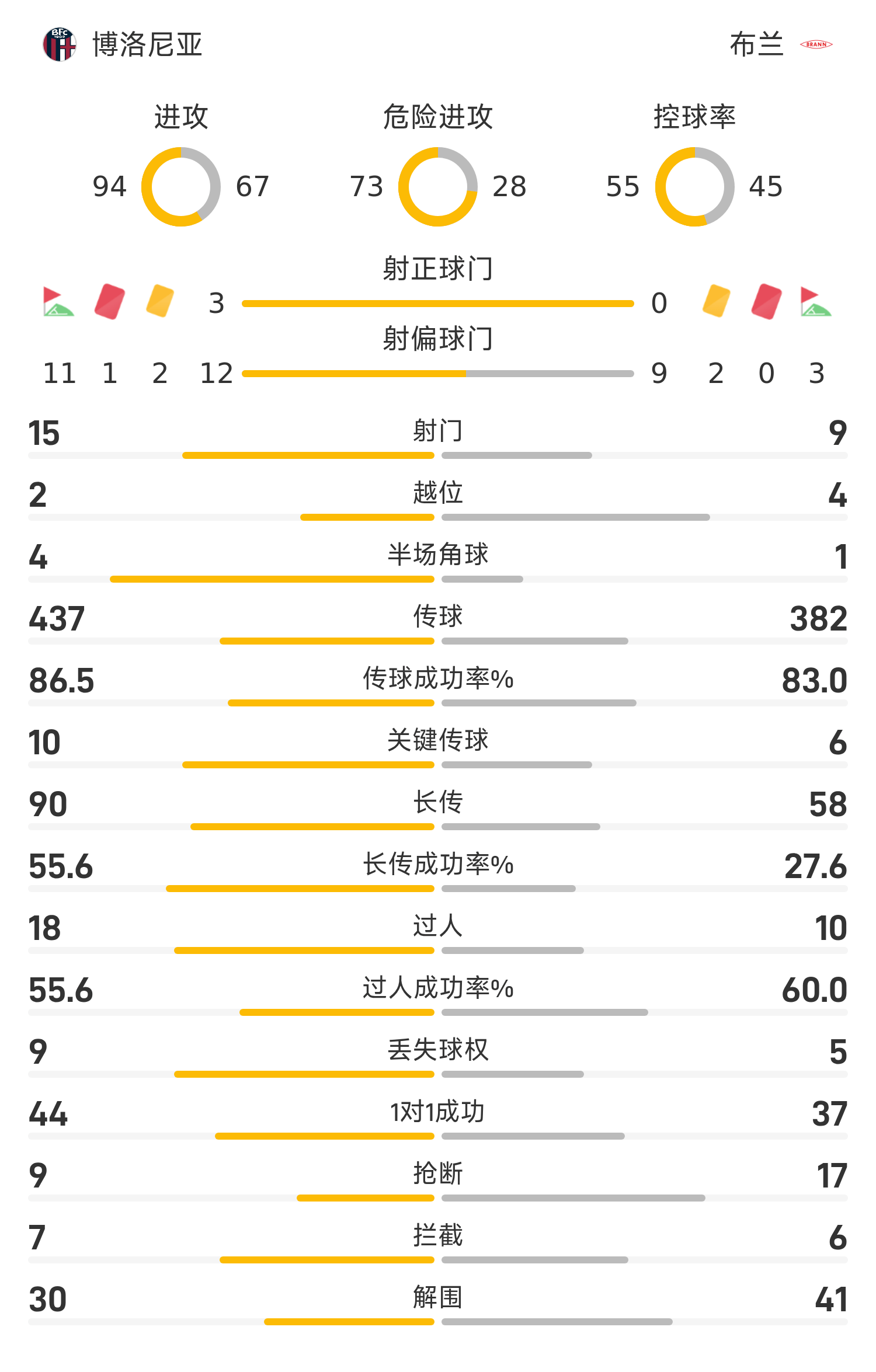 รายงานผลการแข่งขันยูโรป้า ลีก ทั้งสองทีมมีโอกาสยิงเข้ากรอบเพียง 3 ครั้ง โบโลญญ่า 10 คนเสมอกับบรานเนน 0-0