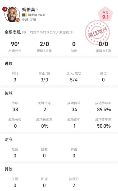 สถิติเต็มเกมของเอ็มเบโม่กับไบรท์ตัน ยิงได้ 2 ประตู อัตราสำเร็จ 89.5%