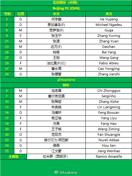 ปักกิ่ง กั๋วอัน รายชื่อตัวจริง:39-จาง เจียนจือ, 3-เหอ หยูเผิง, 5-งาเทวู, 26-โบ หยาง, 27-หวัง กัง, 8-กูเจีย, 21-จาง หยวน, 23-ดาวาน, 37-เกา หยงจิง, 9-จาง หยุนหนิง, 29-ฟาบิโอ
