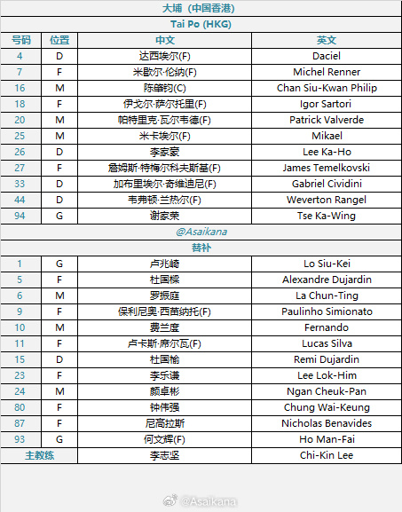 ทาปู รายชื่อตัวจริง:94-ซี เจียหรง, 4-ดาซีแยร์, 33-ชิวิดินี่, 44-เวเวอร์ตัน, 26-หลี่ เจียห่าว, 16-ชาน จ้าวจุน, 20-บัลเบร์เด, 25-มิคาเอล, 7-มิเชล เรน่า, 18-ซาร์โตรี, 27-เทเมคอฟสกี้